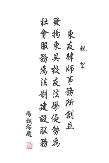 1996年,北京市东友律师事务所在东吴大学北京校友会的倡议和支持下成立,以东吴大学校训“养天地正气,法古今完人”作为东友所训,“东友”即东吴校友的简称,由雷洁琼委员长提字“东友律师事务所”,为勉励东友人发扬东吴精神,雷老又题写“东吴精神,代代相传”的墨宝。随后,倪征燠老师为东友题写赠语”法界俊彦“,杨铁樑大法官也为东友题写了赠言。东吴校友、法学教授、最高人民法院原局级审判员、中国国际经济贸易委员会仲裁员沈关生先生担任东友名誉主任。